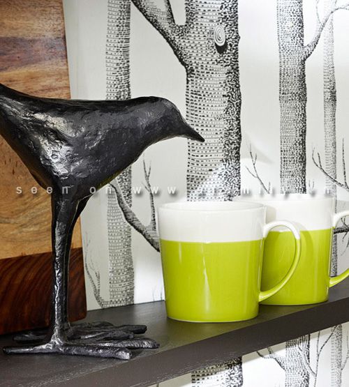 Góc kệ là nơi hoàn hảo để hiển thị phụ kiện độc đáo và cá tính. Phía sau kệ được phủ một tấm hình nền đơn sắc hình cây bạch dương tạo ra một phông nền trưng bày ấn tượng và đầy tính nghệ thuật. Phụ kiện hiện đại, chẳng hạn như bức tượng con chim màu đen như là một điểm nhấn vui tươi cho hình ảnh cây giả. Những chiếc ly cà phê màu táo xanh bổ sung thêm màu sắc tươi sáng cho không gian mang đến một cái nhìn cân đối.
