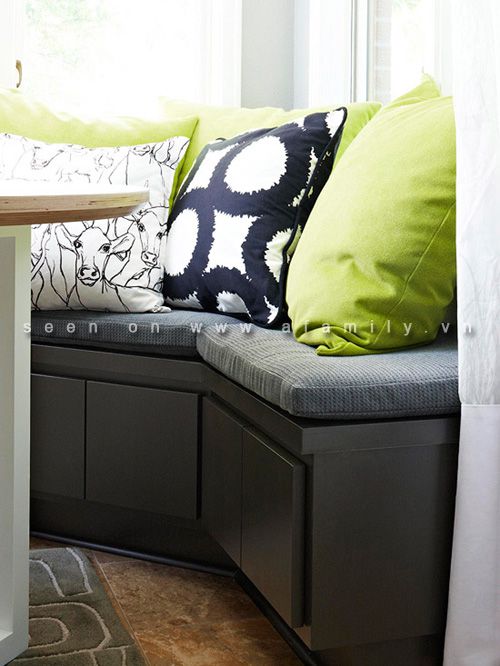 Băng ghế dự bị được xây dựng thành một góc ăn sáng thú vị, tiện ích. Bên dưới được tận dụng cho mục đích lưu trữ khá gọn gàng, giữ cho mức lộn xộn ở mức tối thiểu. Gối vuông đơn giản trong sự pha trộn màu sắc tương phản giúp tạo ra một bầu không khí ấm cúng. Những chiếc gối không chỉ tăng thêm sự thoải mái cho khu vực ngồi mà sự nổi bật của màu sắc và các họa tiết khắc họa rõ nét hơn phong cách cho nhà bếp.