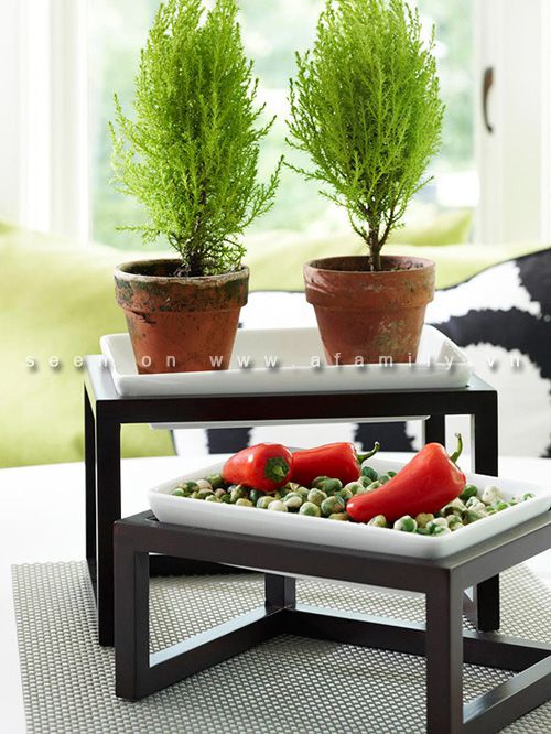 Quá nhiều màu đen trong một không gian bếp nhỏ có thể gây ra sự áp đảo. Do đó, cần kết hợp với các phụ kiện trang trí mềm có kết cấu và hình dạng tự nhiên. Sắp đặt ở khu vực ăn uống các khay gia vị như ớt, đậu Hà Lan vừa tiện dụng lại vừa sinh động. Nó cũng là bổ sung hoàn hảo cho cặp cây cảnh nhỏ xinh trên mặt bàn ăn.