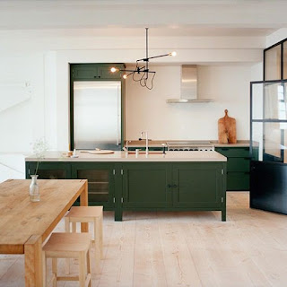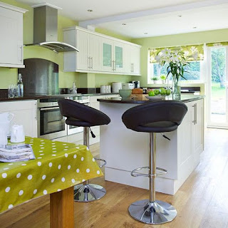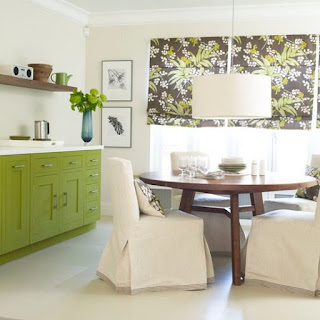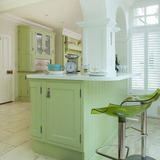 Hoặc như tủ bếp xanh lá cây tươi đi kèm với ghế tựa và sơn tường màu be nền nã.